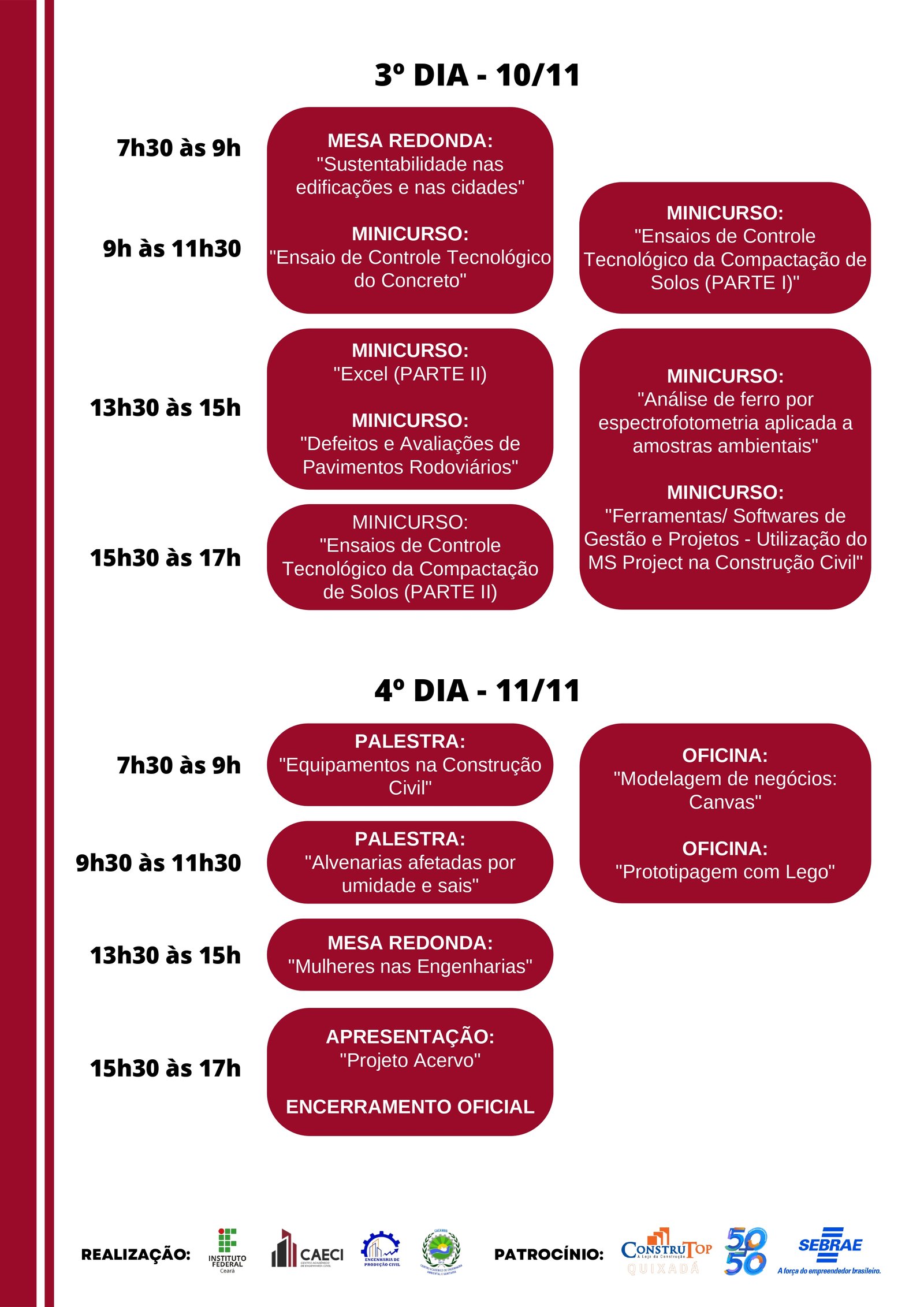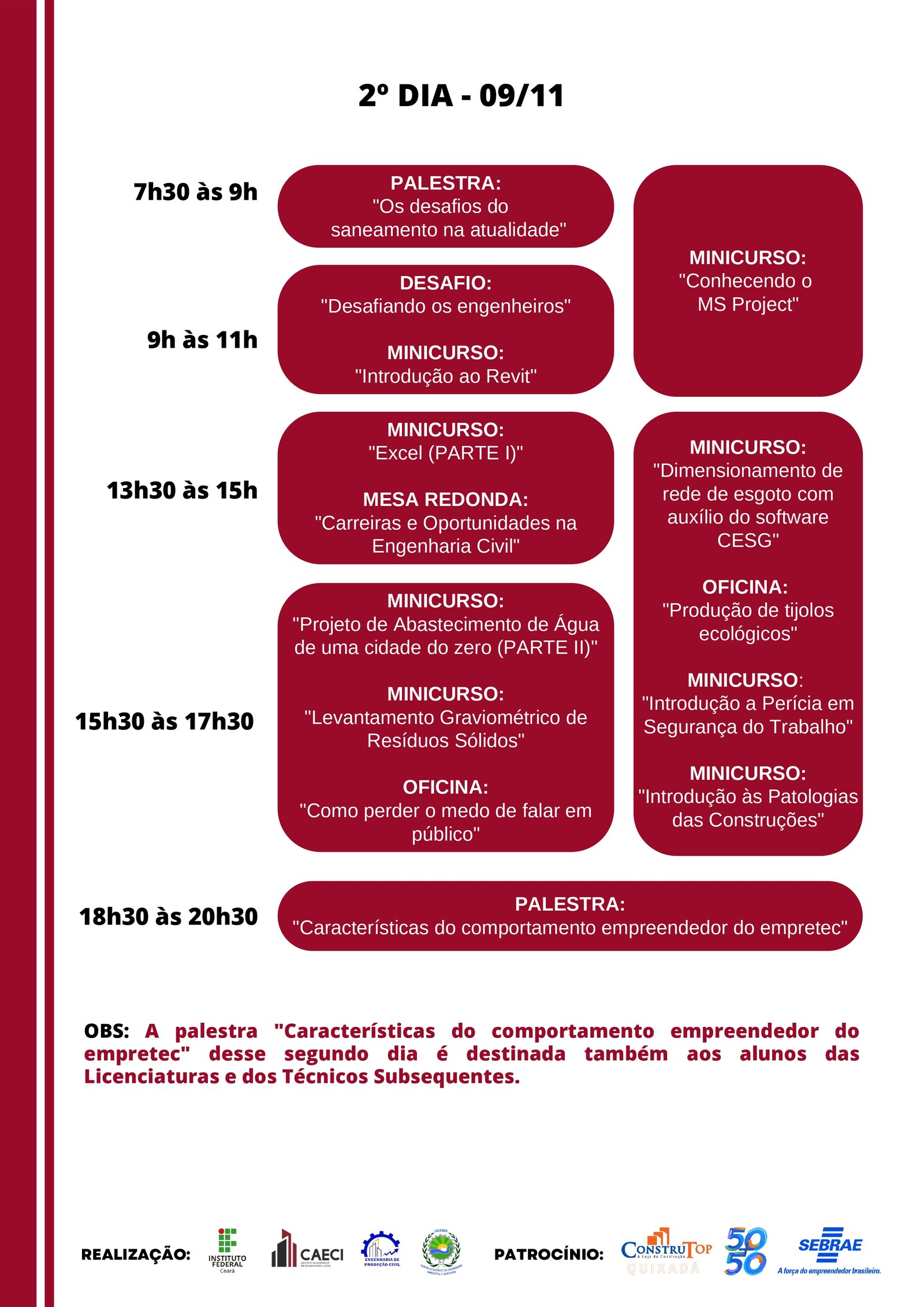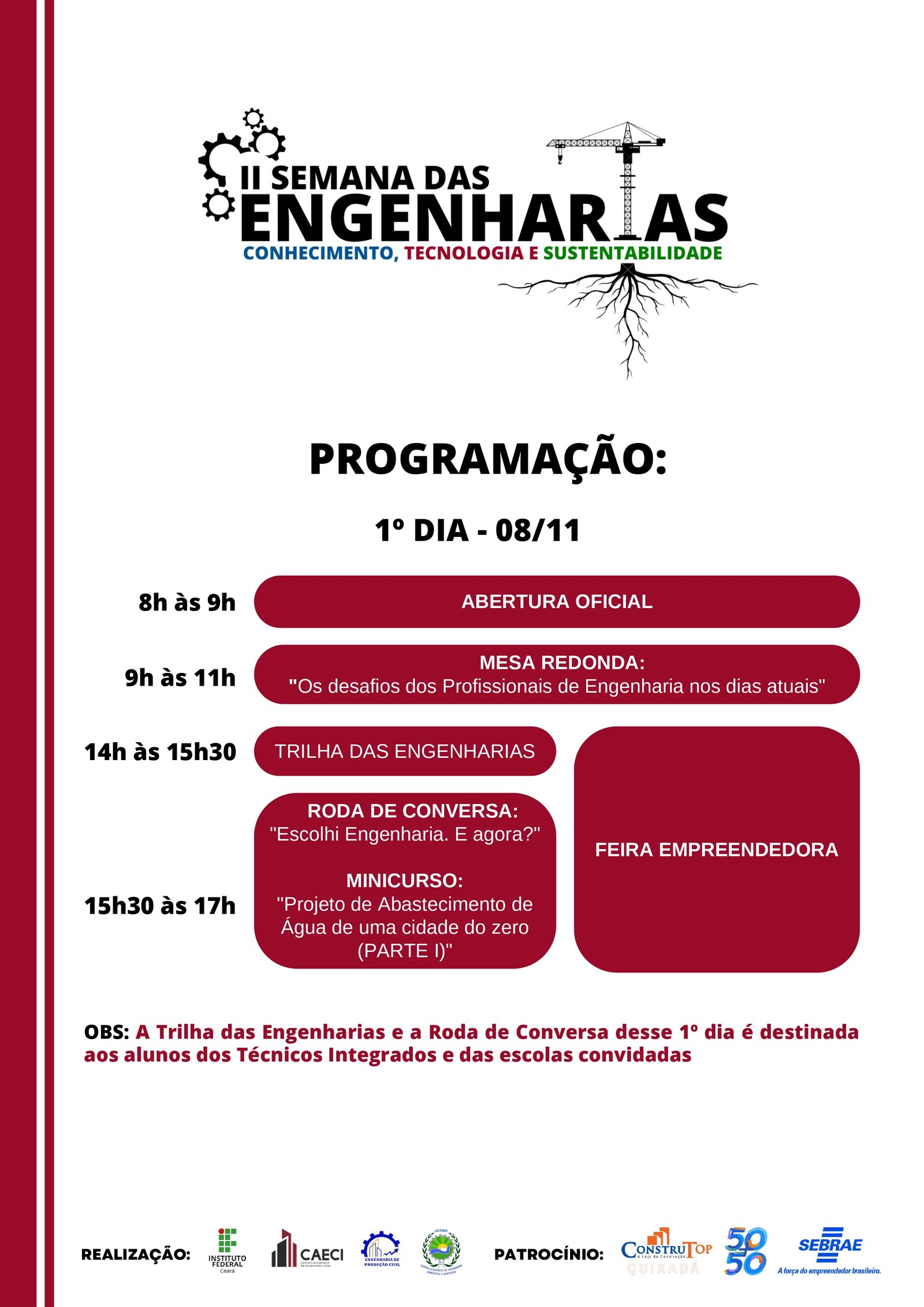 A abertura oficial ocorrerá no dia 8, às 8h. No mesmo dia, pela tarde, o Instituto receberá estudantes de escolas convidadas, para que os alunos possam conhecer o campus do IFCE e os cursos de engenharia.